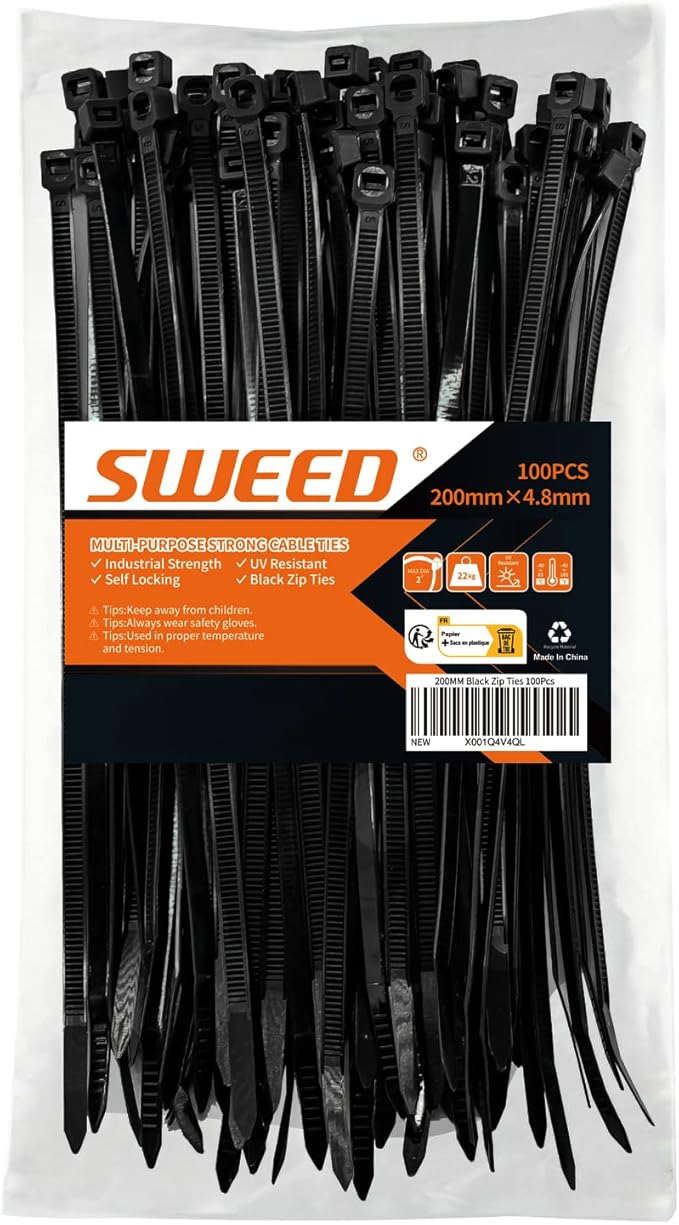 SWEED Kabelbinder Schwarz 200mm x 4.8mm, 100 Stück Kabelbinder UV Beständig, Schwarze Kabelbinder Mit 22Kg, Zugfestigkeit Kann im Innen- und Außenbereich Verwendet